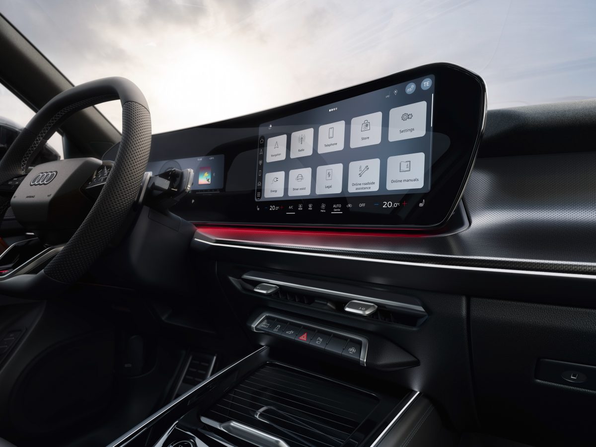 Integra una pantalla panorámica MMI de 12.8 pulgadas. Para liberar espacio y maximizar el confort, Audi ha rediseñado la unidad de mando, integrando el selector de marchas directamente en la columna de dirección. Esto despeja la consola central, ofreciendo un diseño más limpio y funcional.
