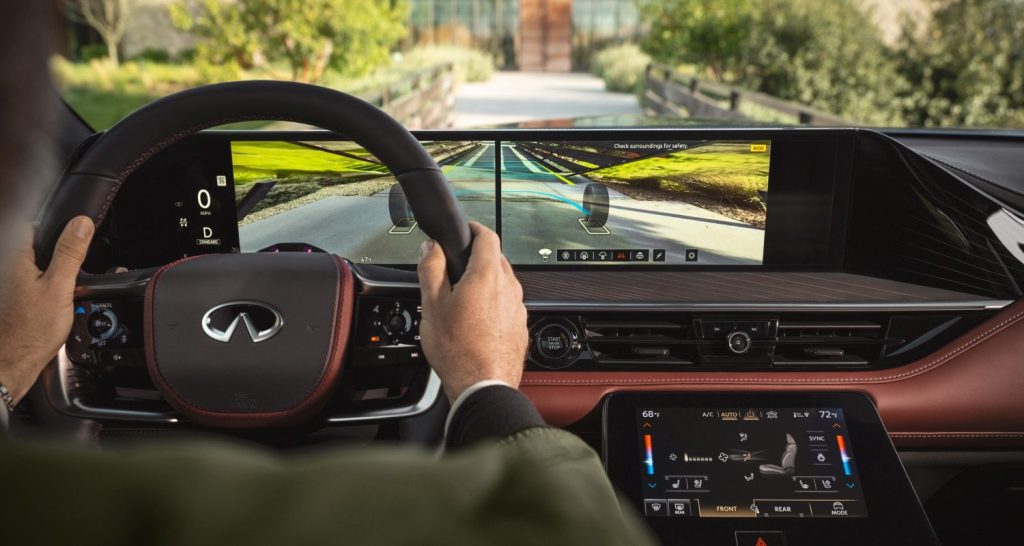 La QX80 estrena la función “Vista Frontal Amplia” (Front Wide View) que proyecta una vista de 170 grados en las pantallas, eliminando puntos ciegos al estacionar.