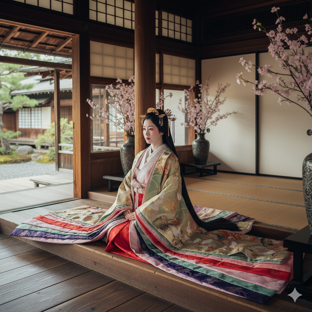 El arte de las capas: Las damas de la corte usaban el jūnihitoe (un atuendo de “doce capas”). Aunque no siempre eran doce, el arte estaba en cómo combinaban los colores de las sedas para que solo un borde diminuto de cada capa se asomara en el cuello y las mangas (kasane no irome). ¡Imaginen el nivel de detalle!