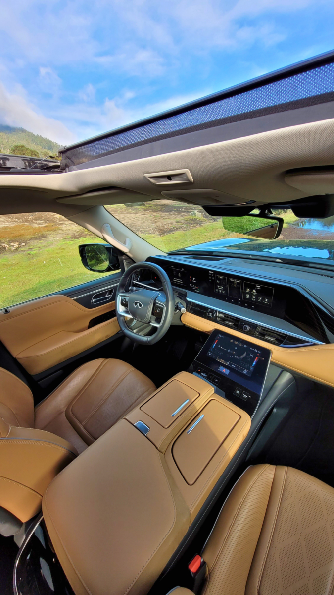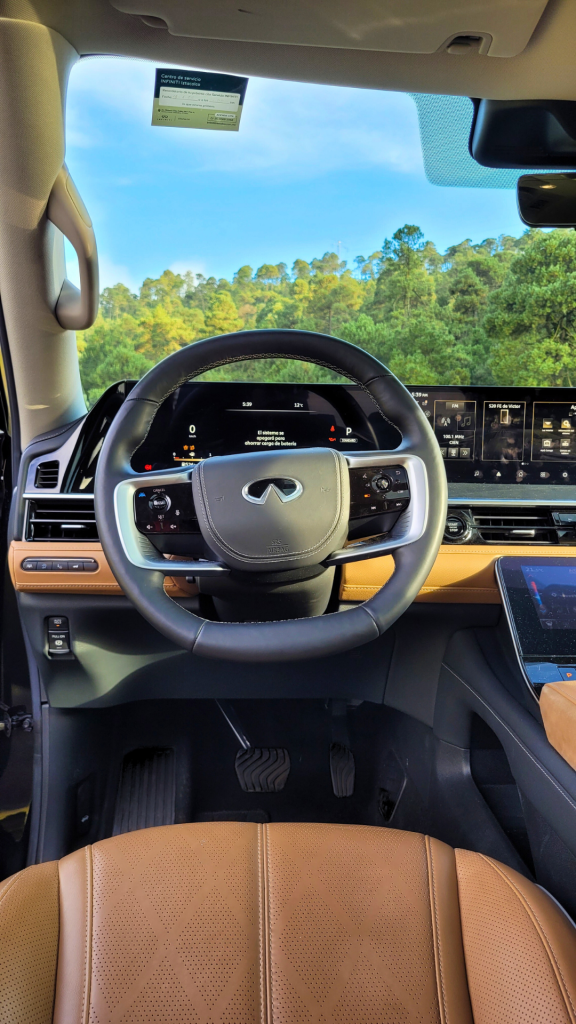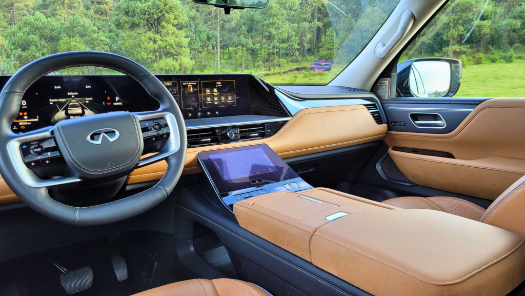 - La tecnología: Aquí es donde aplican el miyabi a lo moderno. Tenemos dos pantallas gigantes de 14.3 pulgadas, una es para tus instrumentos (velocímetro, etc.). La otra es la central, ¡la cual es compatible con Apple CarPlay, Android Auto y Google Maps integrado! Un súper acierto. Pero la joya de la corona, y aquí se nota que pensaron en la “gracia” y no en la frustración, es la tercera pantalla (de nueve pulgadas) dedicada solo al aire acondicionado y los asientos. ¡Gracias, INFINITI! Qué frustrante es tener que buscar en tres menús solo para bajar la temperatura, ¿cierto? Aquí es directo, dedicado y hasta vibra un poquito para que sepas que sí le picaste. Un 10 ahí.